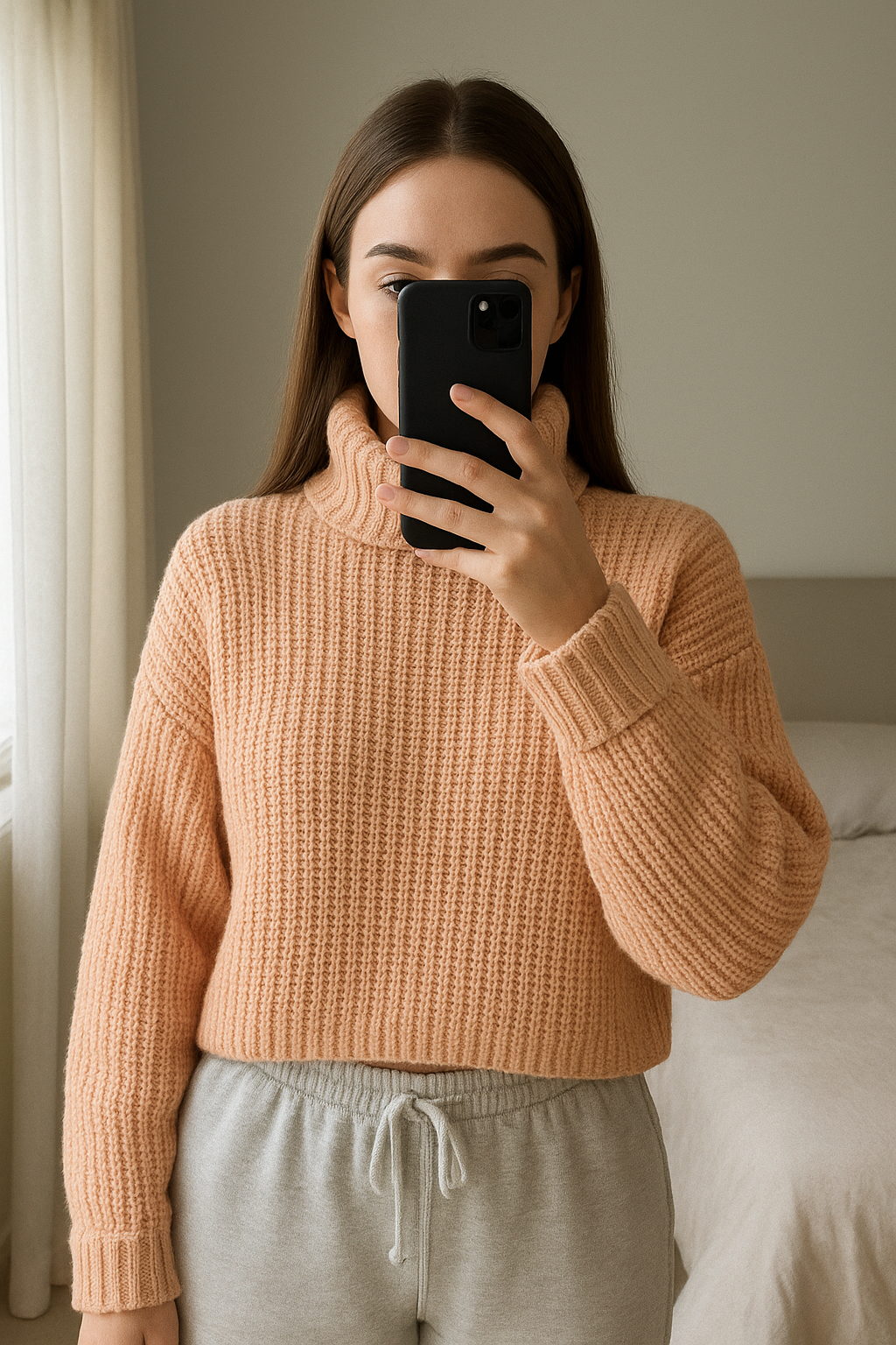 Pull col montant / col roulé debout, face à la caméra, dans une chambre à la lumière douce, avec une lumière naturelle filtrant par la fenêtre.