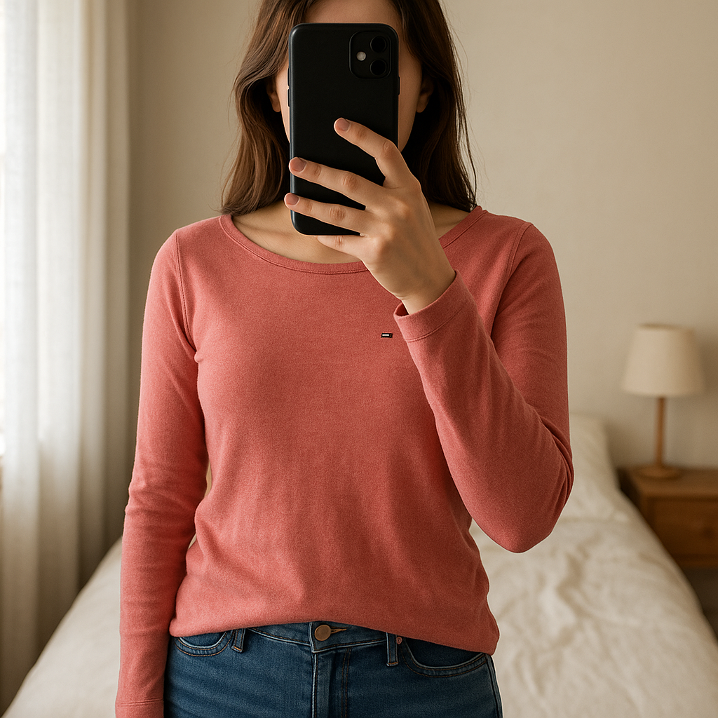 Pull Col Rond Tommy Hilfiger Denim Rose S debout, face à la caméra, dans une chambre à la lumière douce, avec une lumière naturelle filtrant par la fenêtre.