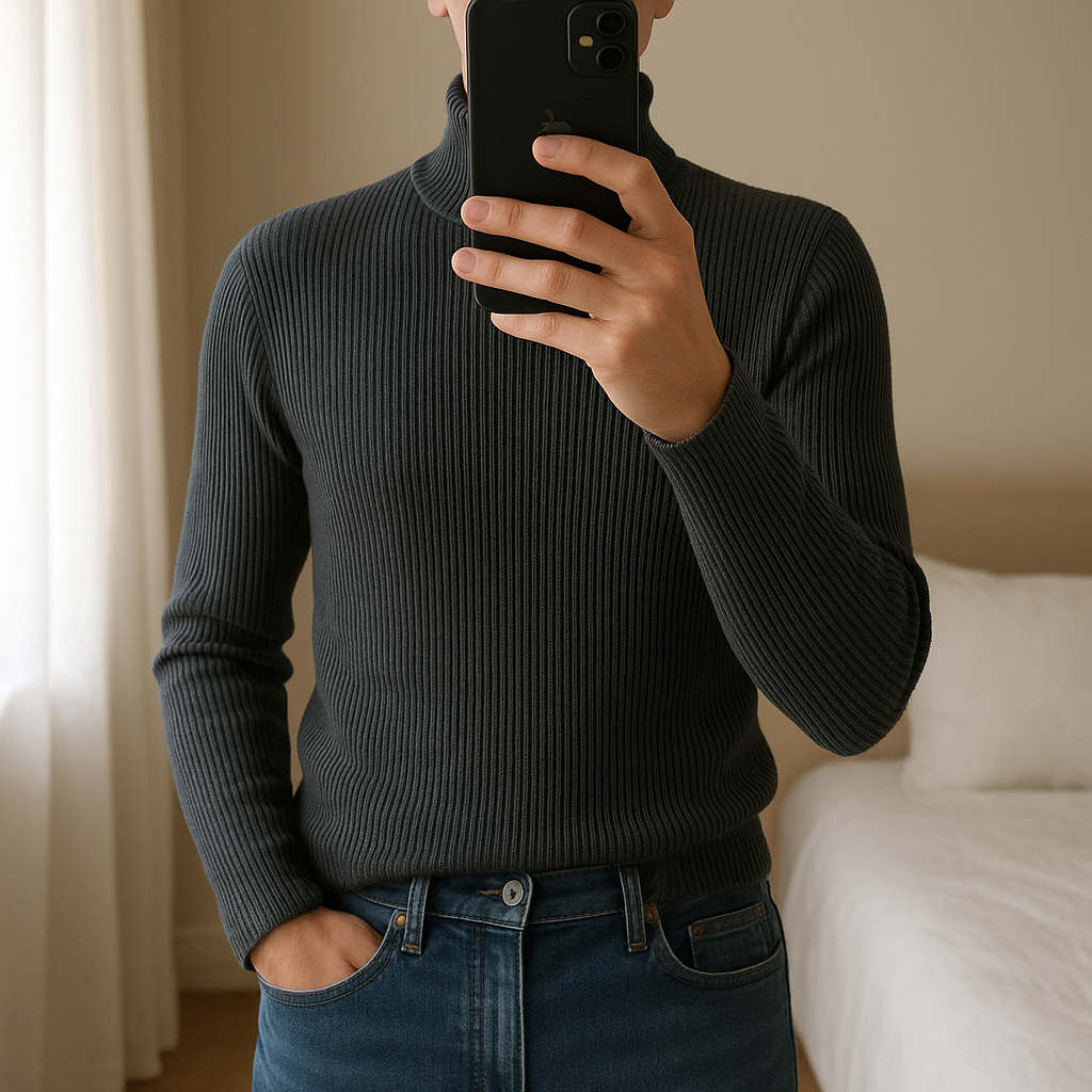 pull col roulé ralph lauren taille m debout, face à la caméra, dans une chambre à la lumière douce, avec une lumière naturelle filtrant par la fenêtre.