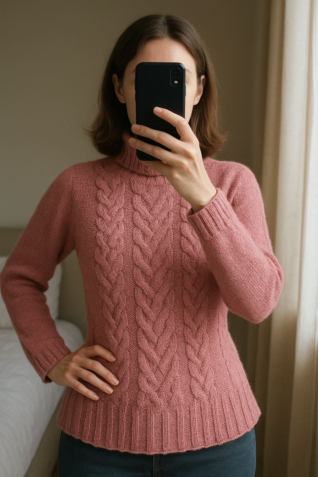 Pull Col roulé Rose Sonoma - Taille L debout, face à la caméra, dans une chambre à la lumière douce, avec une lumière naturelle filtrant par la fenêtre.