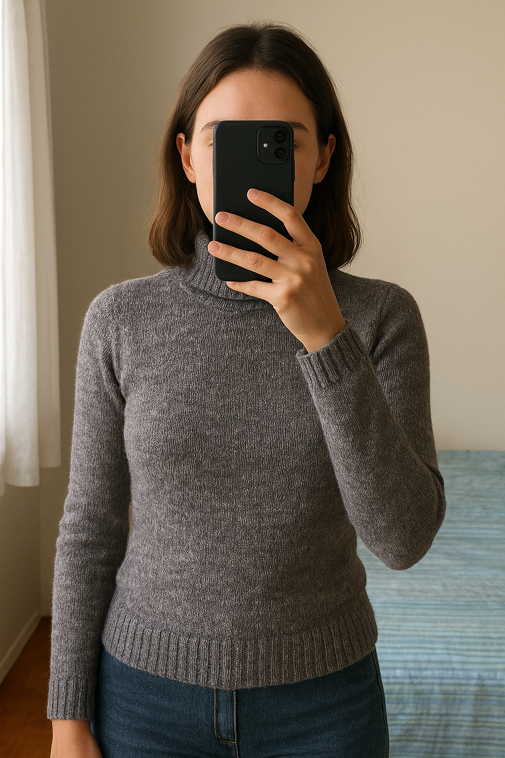 Pull Col Roulé À Torsades Façon Fil D'écosse debout, face à la caméra, dans une chambre à la lumière douce, avec une lumière naturelle filtrant par la fenêtre.