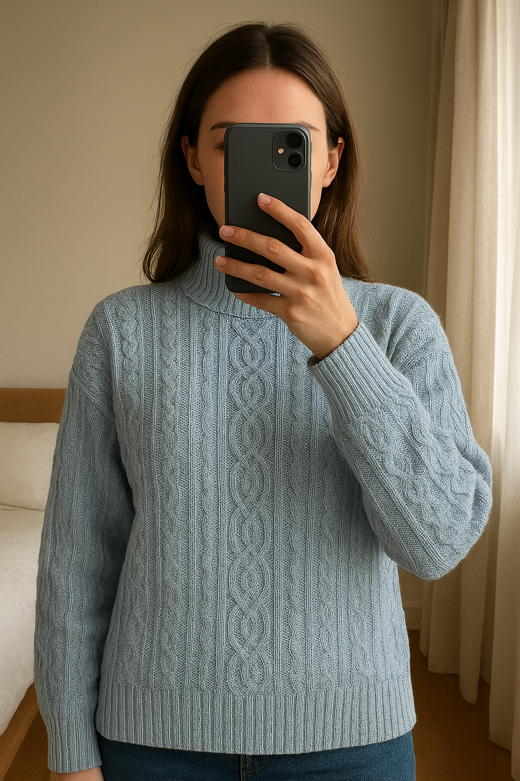 Pull Col Roulé Wainscoll Bleu Femme - Taille M debout, face à la caméra, dans une chambre à la lumière douce, avec une lumière naturelle filtrant par la fenêtre.