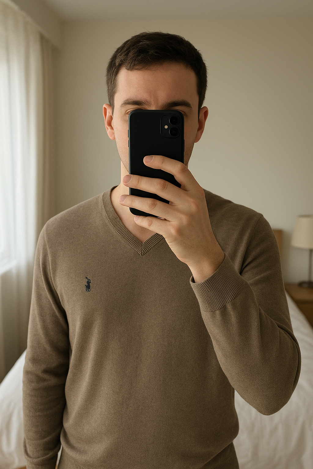 Une personne en Pull Col V Polo Ralph Lauren Homme Taille L debout, face à la caméra, dans une chambre à la lumière douce, avec une lumière naturelle filtrant par la fenêtre.