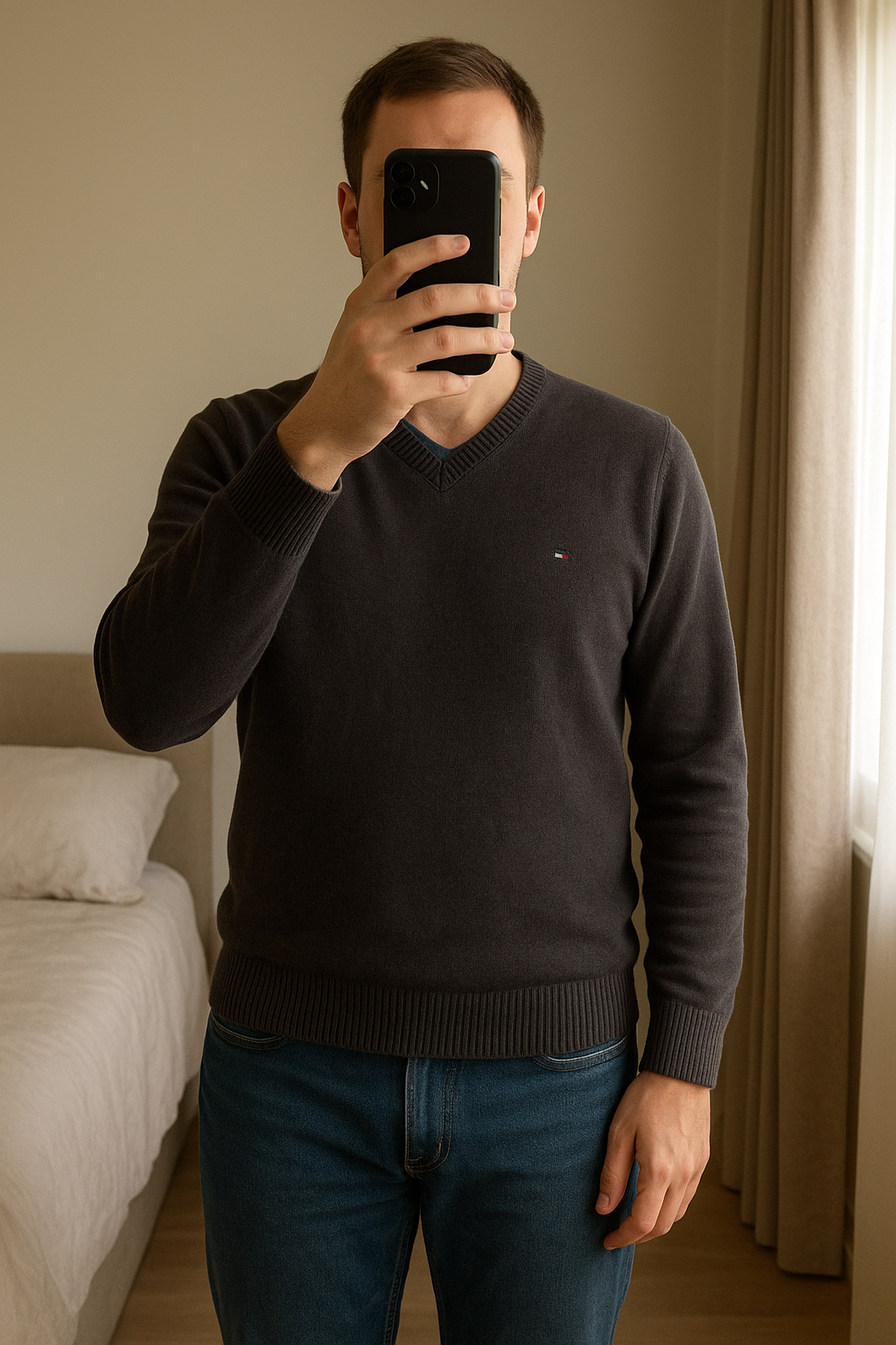 Pull Col V Tommy Hilfiger 100% Premium coton Marron M debout, face à la caméra, dans une chambre à la lumière douce, avec une lumière naturelle filtrant par la fenêtre.
