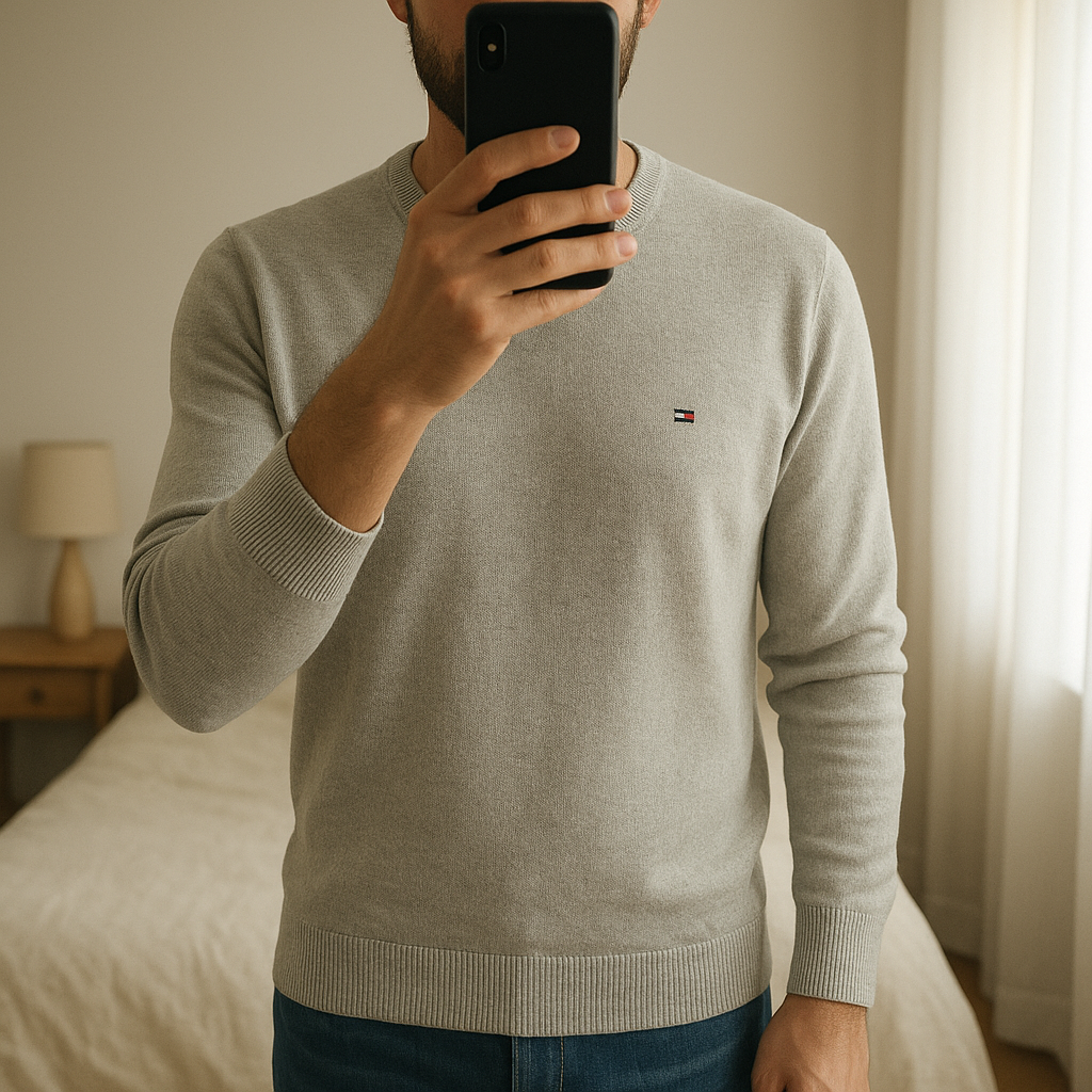 Pull col V Tommy Hilfiger homme M – gris debout, face à la caméra, dans une chambre à la lumière douce, avec une lumière naturelle filtrant par la fenêtre.