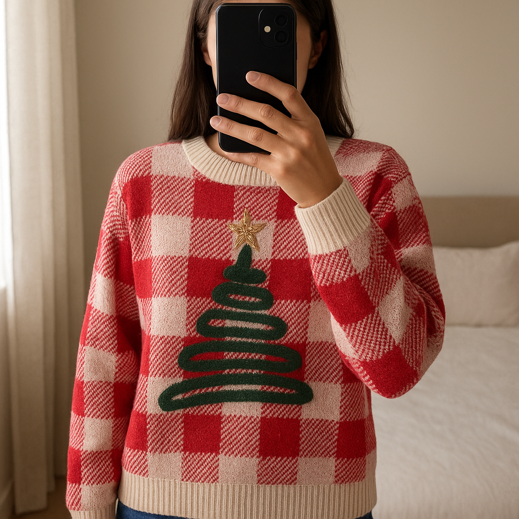 Pull de Noël sapin debout, face à la caméra, dans une chambre à la lumière douce, avec une lumière naturelle filtrant par la fenêtre.