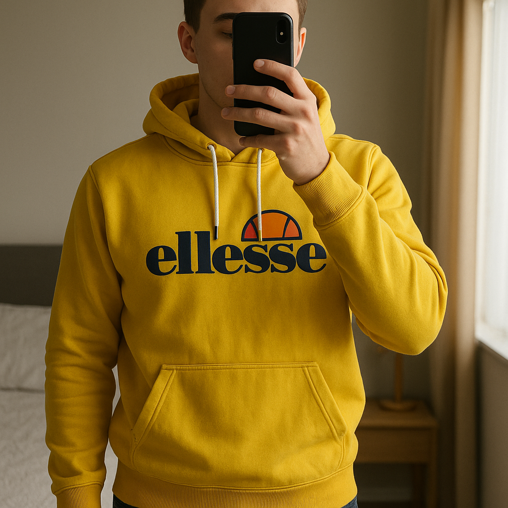 Pull Ellese S debout, face à la caméra, dans une chambre à la lumière douce, avec une lumière naturelle filtrant par la fenêtre.