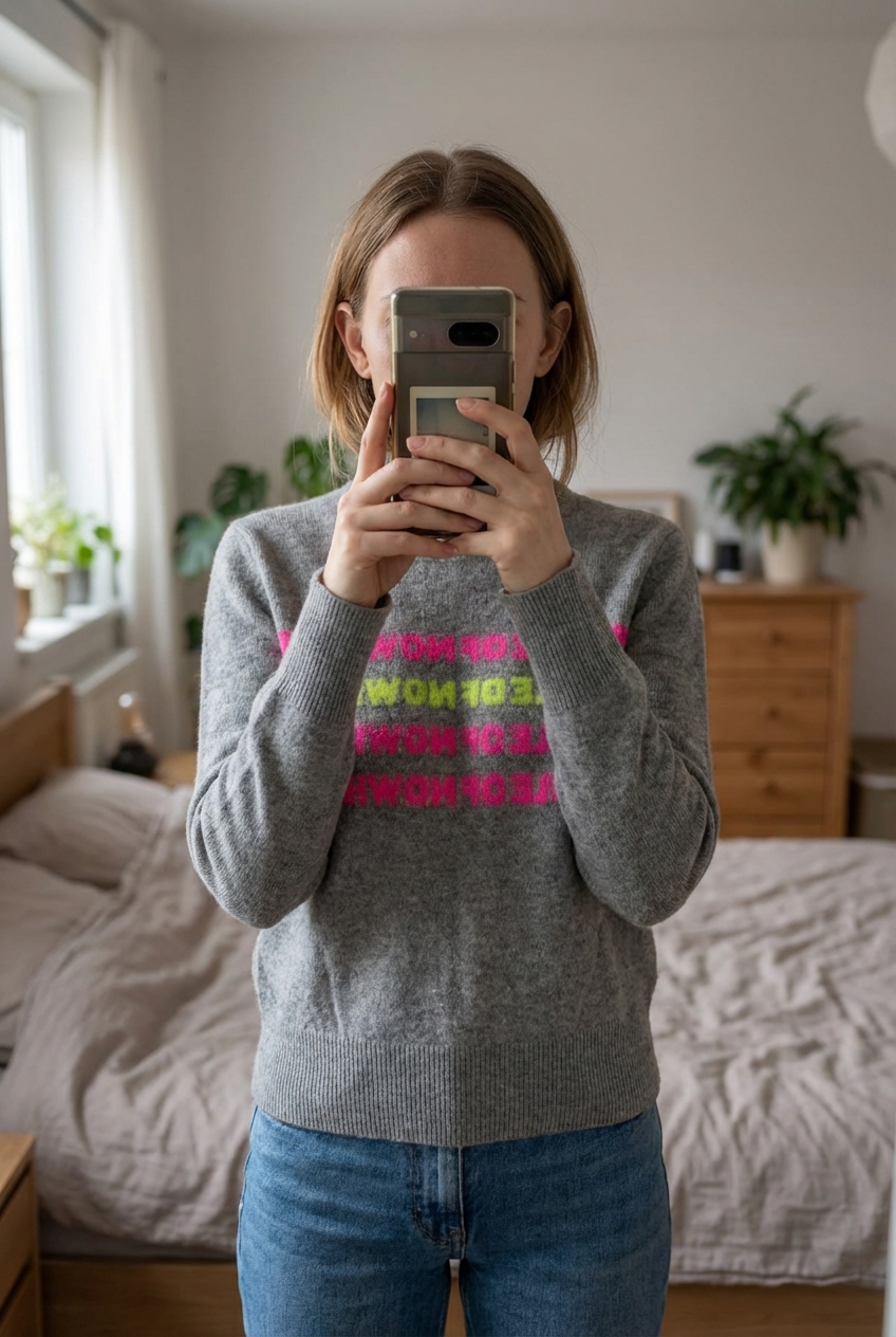 Pull en cachemire From Future debout, face à la caméra, dans une chambre à la lumière douce, avec une lumière naturelle filtrant par la fenêtre.