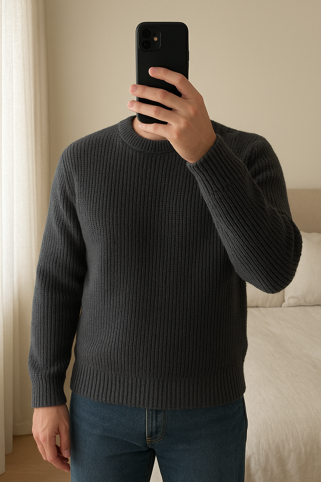 Pull en laine debout, face à la caméra, dans une chambre à la lumière douce, avec une lumière naturelle filtrant par la fenêtre.