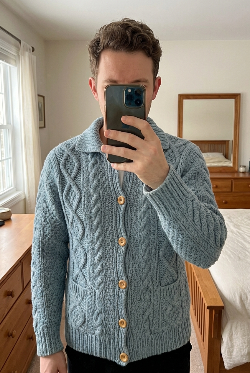 Pull Fait Main Tricot Aran Sweater En Ramie Bleu Aran S debout, face à la caméra, dans une chambre à la lumière douce, avec une lumière naturelle filtrant par la fenêtre.