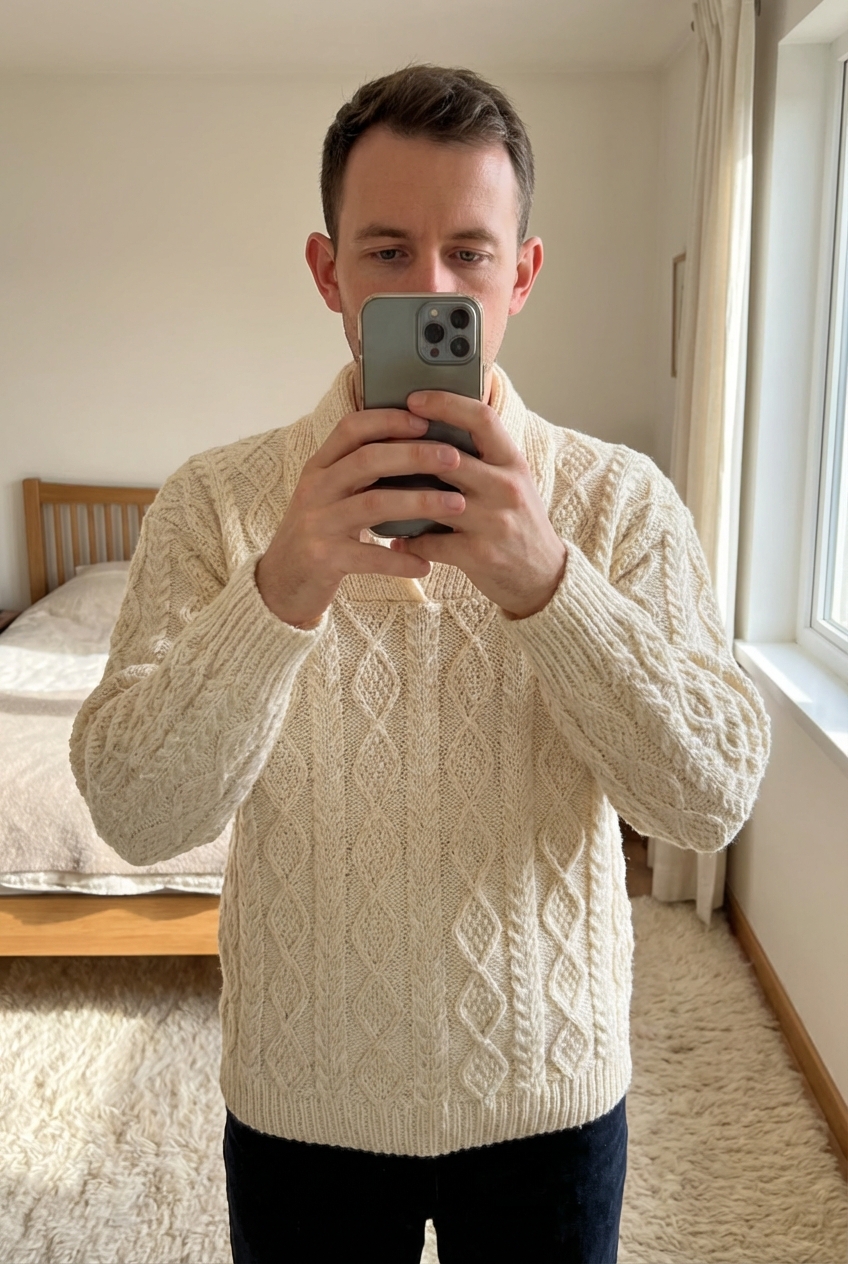 Pull Fait Main Tricot Aran Wool Sweater 100% Laine Beige Crème Aran Craft XL debout, face à la caméra, dans une chambre à la lumière douce, avec une lumière naturelle filtrant par la fenêtre.