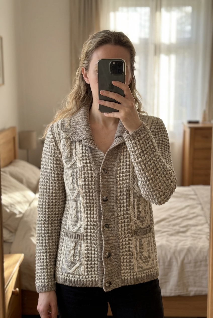 Pull Fait Main Tricot Aran Wool Sweater 100% Laine Gris et Crème Aran Craft XL debout, face à la caméra, dans une chambre à la lumière douce, avec une lumière naturelle filtrant par la fenêtre.