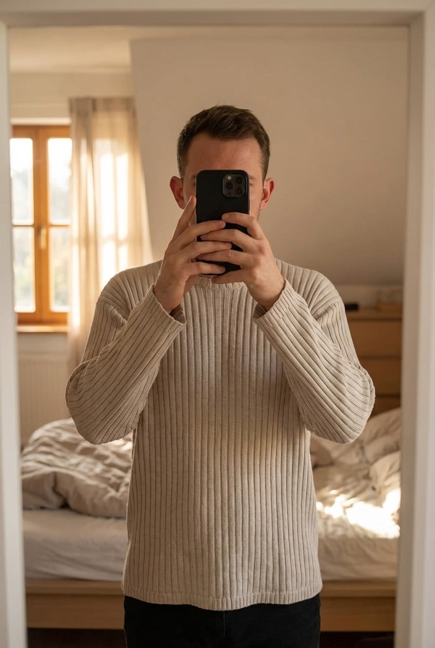 Pull gris clair vintage de la marque Jules, en maille côtelée 100% coton - Taille XXL debout, face à la caméra, dans une chambre à la lumière douce, avec une lumière naturelle filtrant par la fenêtre.