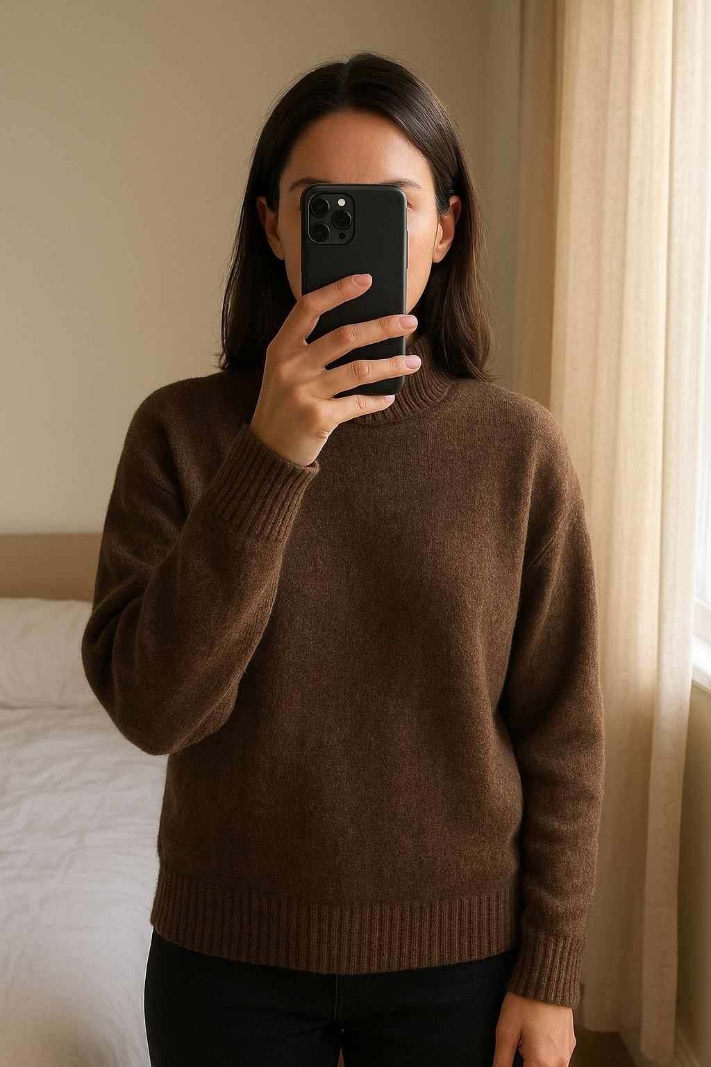 Pull h&m debout, face à la caméra, dans une chambre à la lumière douce, avec une lumière naturelle filtrant par la fenêtre.