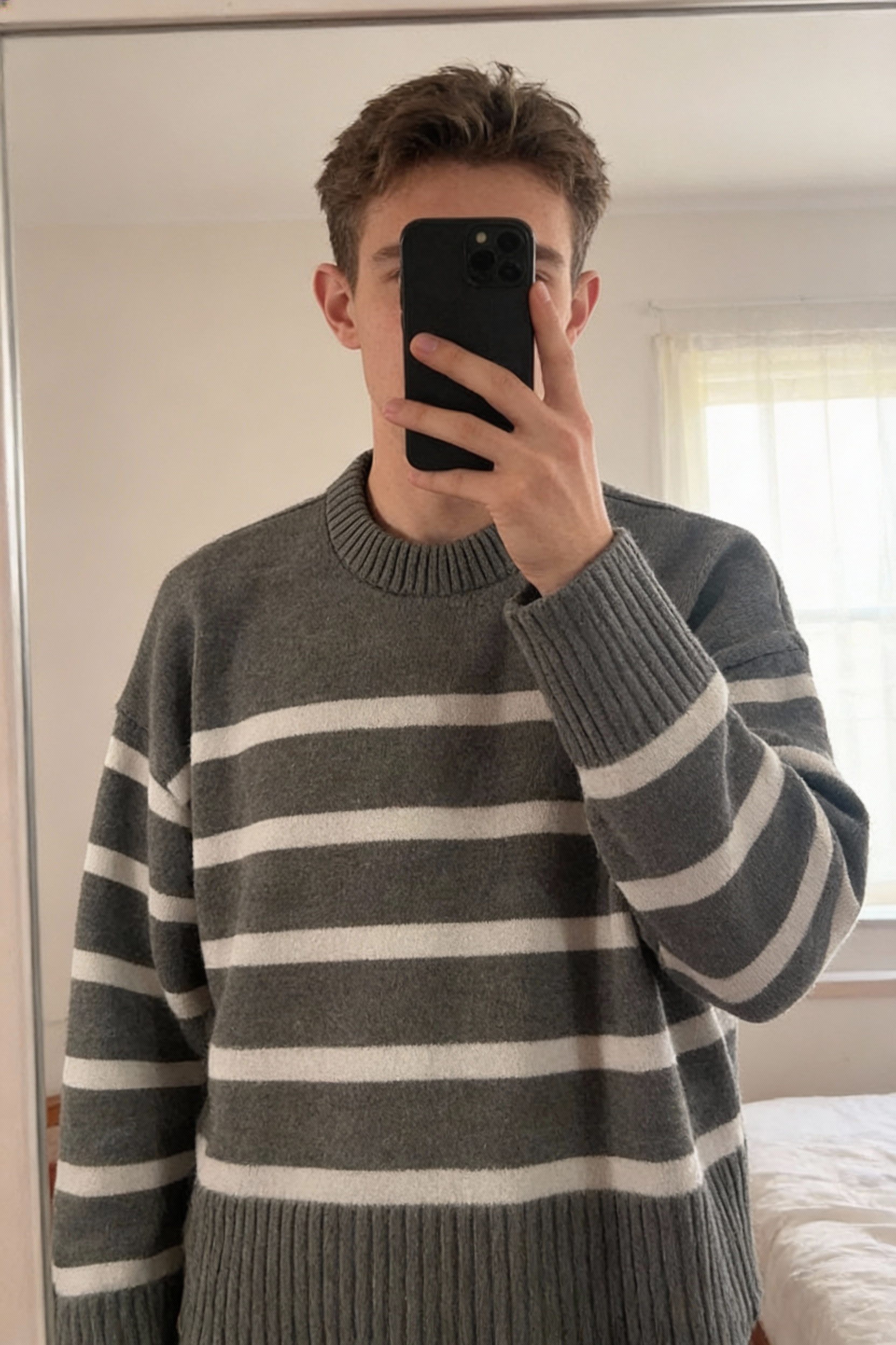 Una persona in Pull hiver à rayures H&M M - Maglione invernali h&m in piedi, rivolto verso la fotocamera, in una camera da letto con luce soffusa e luce naturale che filtra dalla finestra.
