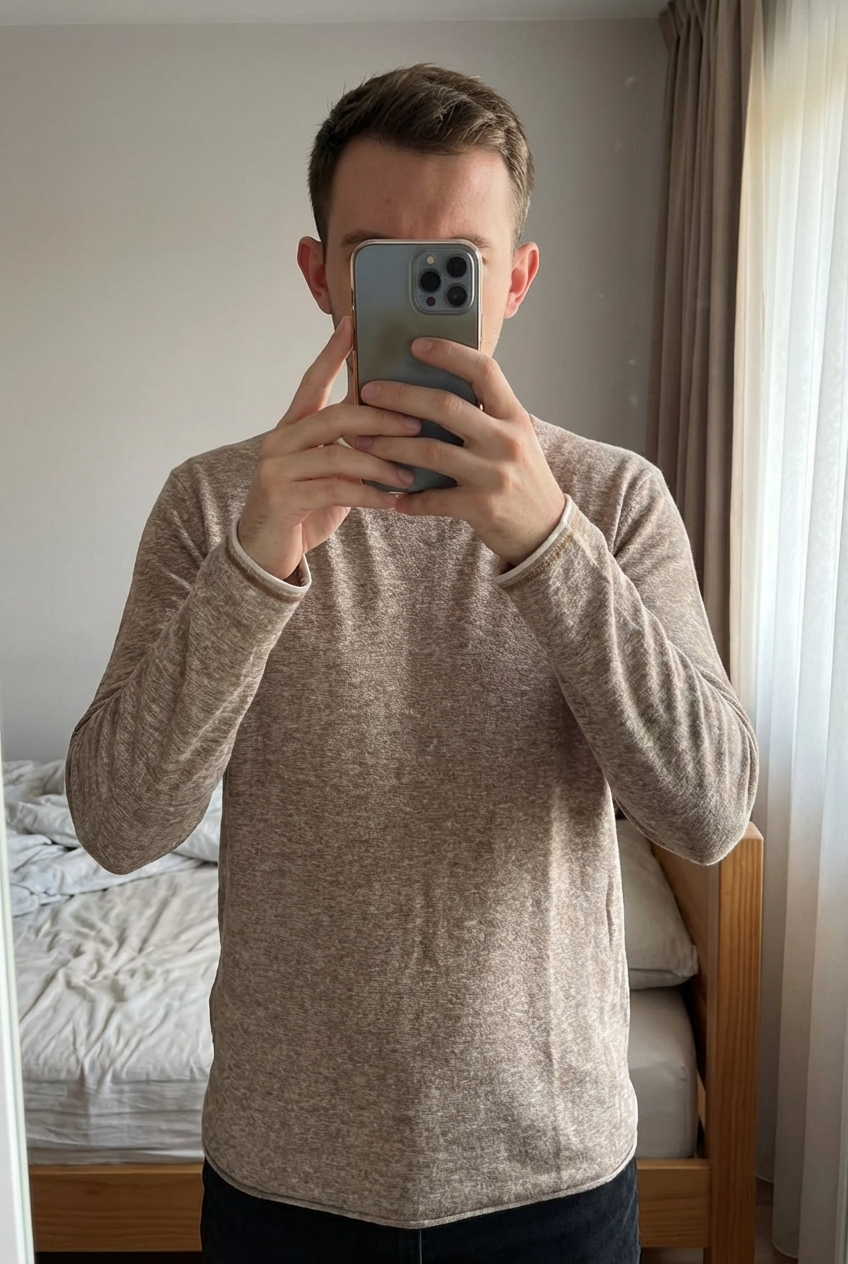 Pull homme L - Maglione uomo L in piedi, rivolto verso la fotocamera, in una camera da letto con luce soffusa e luce naturale che filtra dalla finestra.