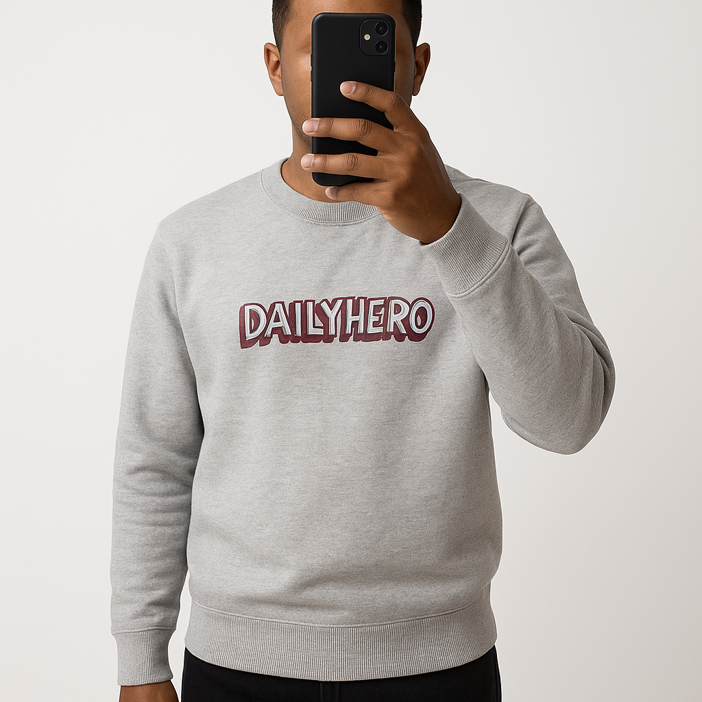 Une personne en pull homme taille L de la marque Jules couleur gris debout, face à la caméra, dans un studio photo épuré avec fond blanc et éclairage doux.