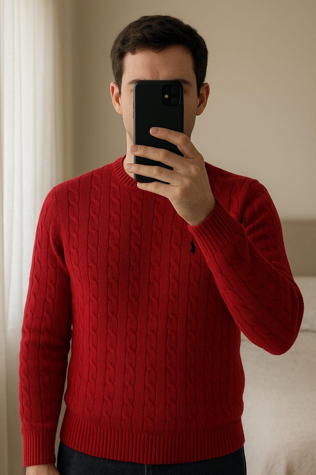 Pull homme torsadé rouge Ralph Lauren M debout, face à la caméra, dans une chambre à la lumière douce, avec une lumière naturelle filtrant par la fenêtre.