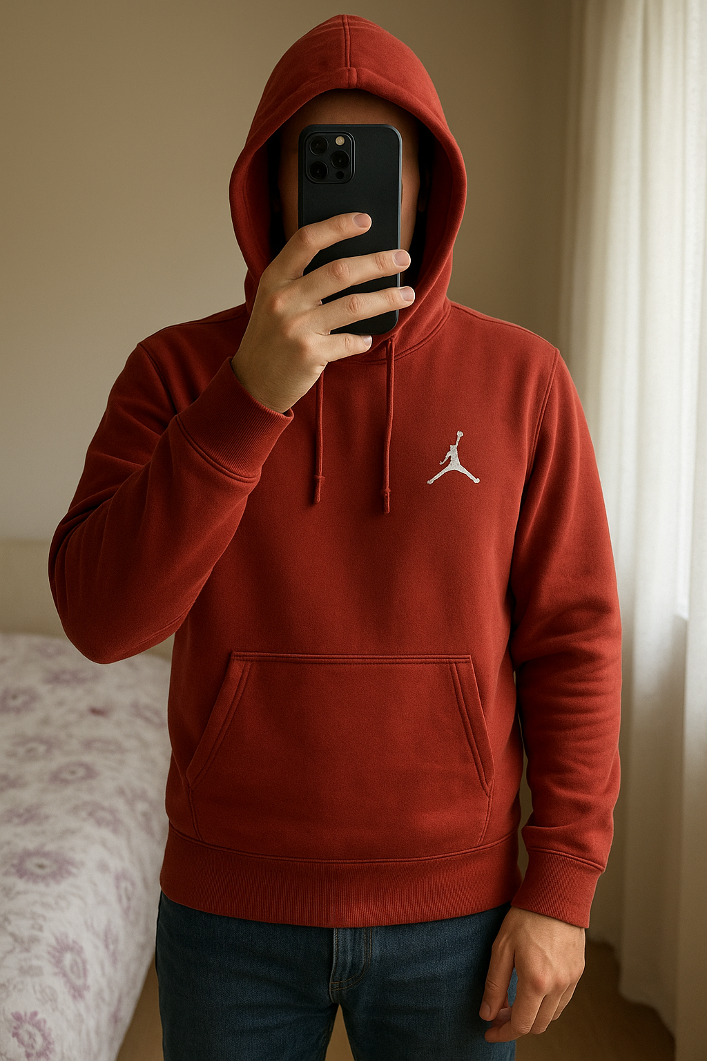 Pull Jordan debout, face à la caméra, dans une chambre à la lumière douce, avec une lumière naturelle filtrant par la fenêtre.