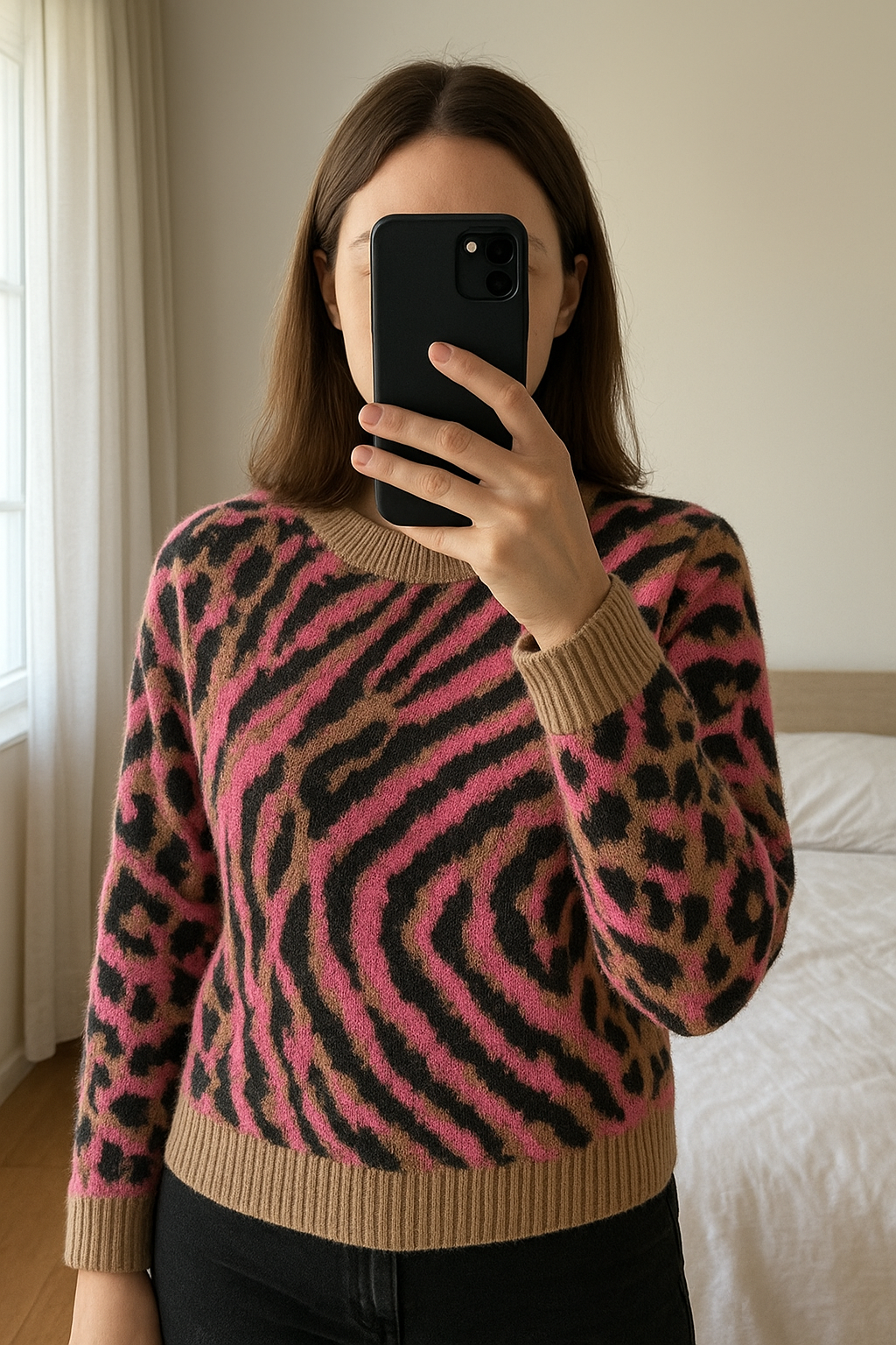 Pull léopard Promod debout, face à la caméra, dans une chambre à la lumière douce, avec une lumière naturelle filtrant par la fenêtre.