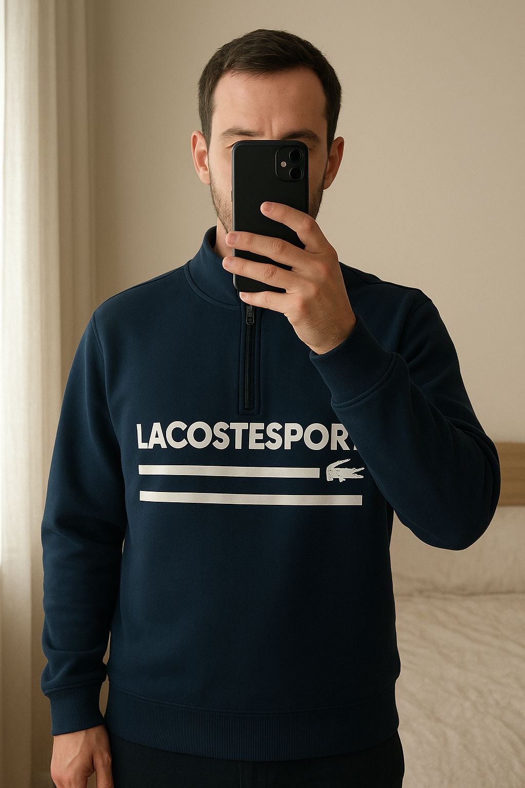 Pull Lacoste sport debout, face à la caméra, dans une chambre à la lumière douce, avec une lumière naturelle filtrant par la fenêtre.