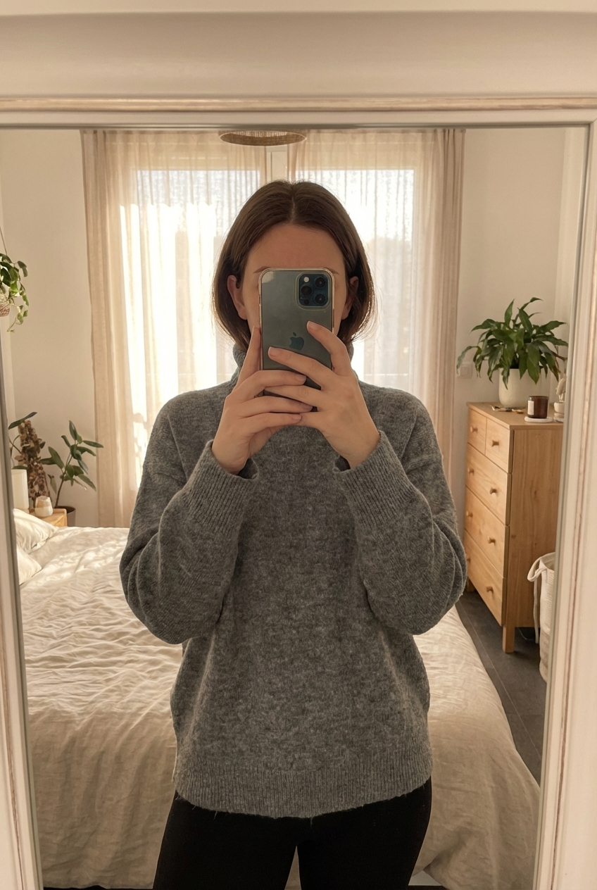 Pull mango laine alpaga gris S debout, face à la caméra, dans une chambre à la lumière douce, avec une lumière naturelle filtrant par la fenêtre.