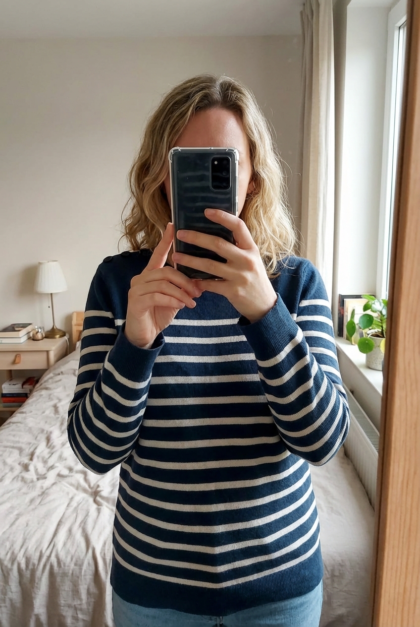 Pull marinière debout, face à la caméra, dans une chambre à la lumière douce, avec une lumière naturelle filtrant par la fenêtre.