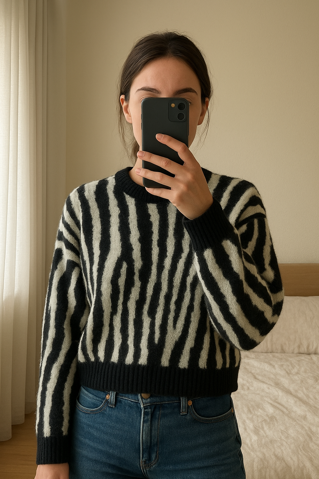Pull à motif zèbre blanc et noir debout, face à la caméra, dans une chambre à la lumière douce, avec une lumière naturelle filtrant par la fenêtre.