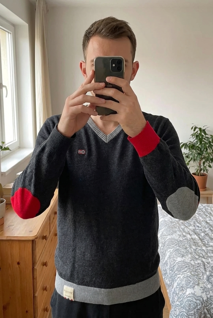 Pull Napapijri Geographic col V, gris anthracite 30% laine - Taille M debout, face à la caméra, dans une chambre à la lumière douce, avec une lumière naturelle filtrant par la fenêtre.