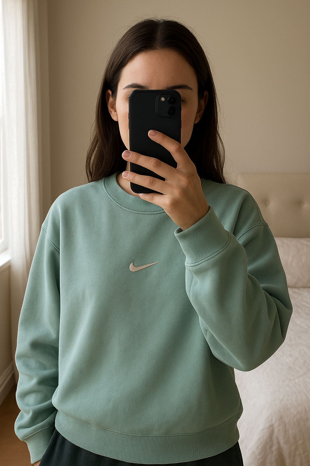 Pull Nike Pastel debout, face à la caméra, dans une chambre à la lumière douce, avec une lumière naturelle filtrant par la fenêtre.
