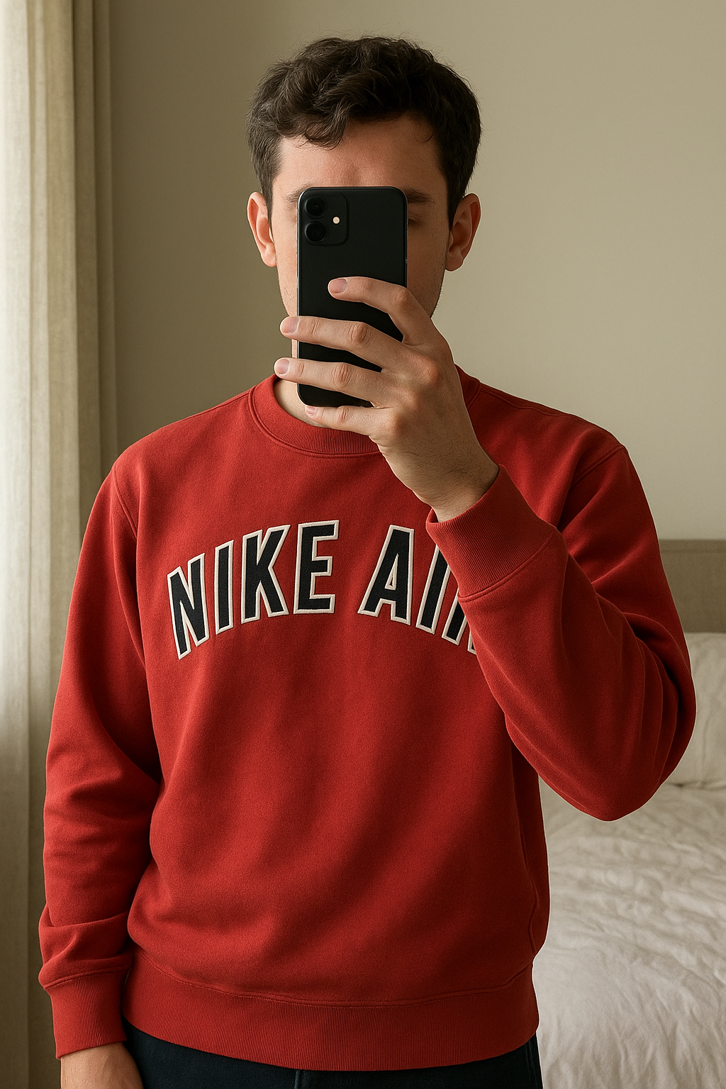 Pull nike vintage debout, face à la caméra, dans une chambre à la lumière douce, avec une lumière naturelle filtrant par la fenêtre.