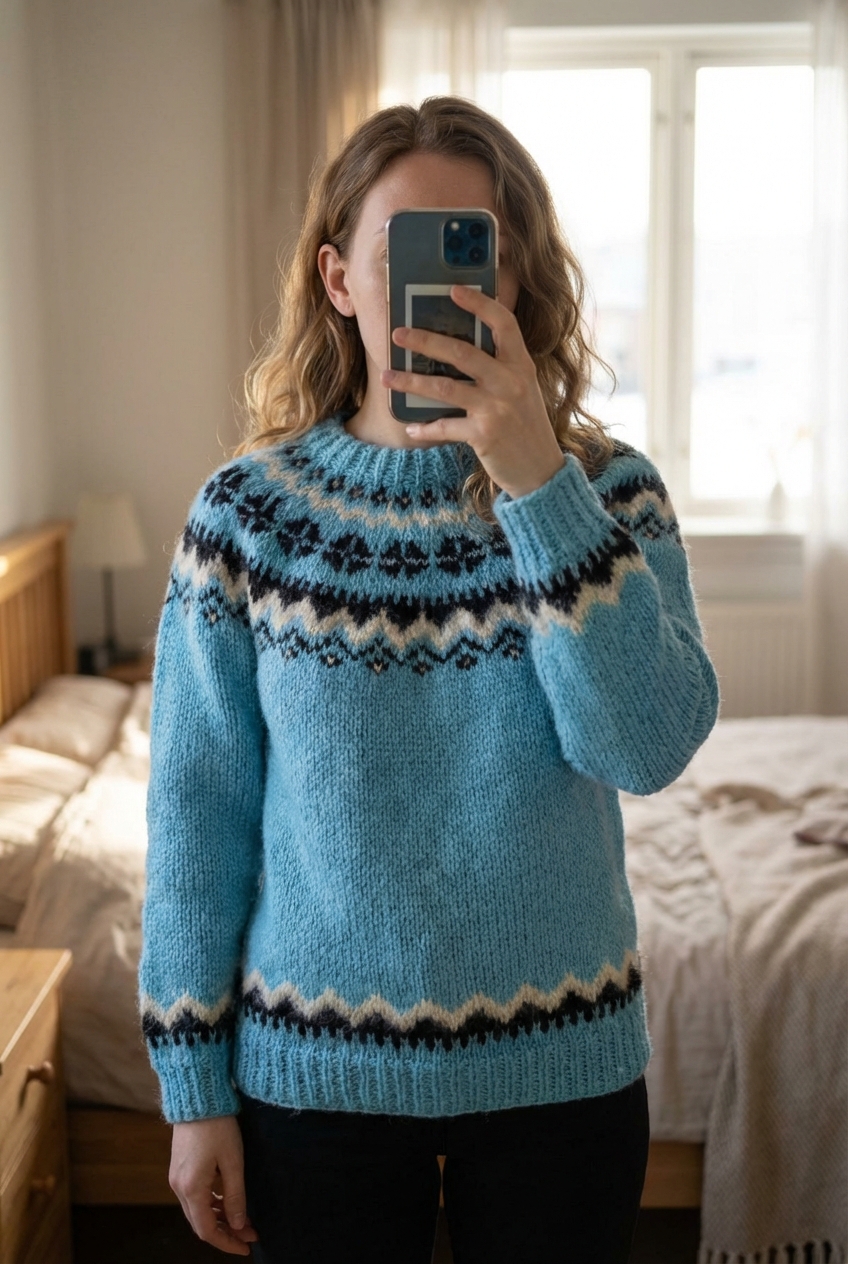 Pull Nordique Iceland Sweater Fait Main Tricot Made in Iceland Handknit 100% Laine Bleu M debout, face à la caméra, dans une chambre à la lumière douce, avec une lumière naturelle filtrant par la fenêtre.