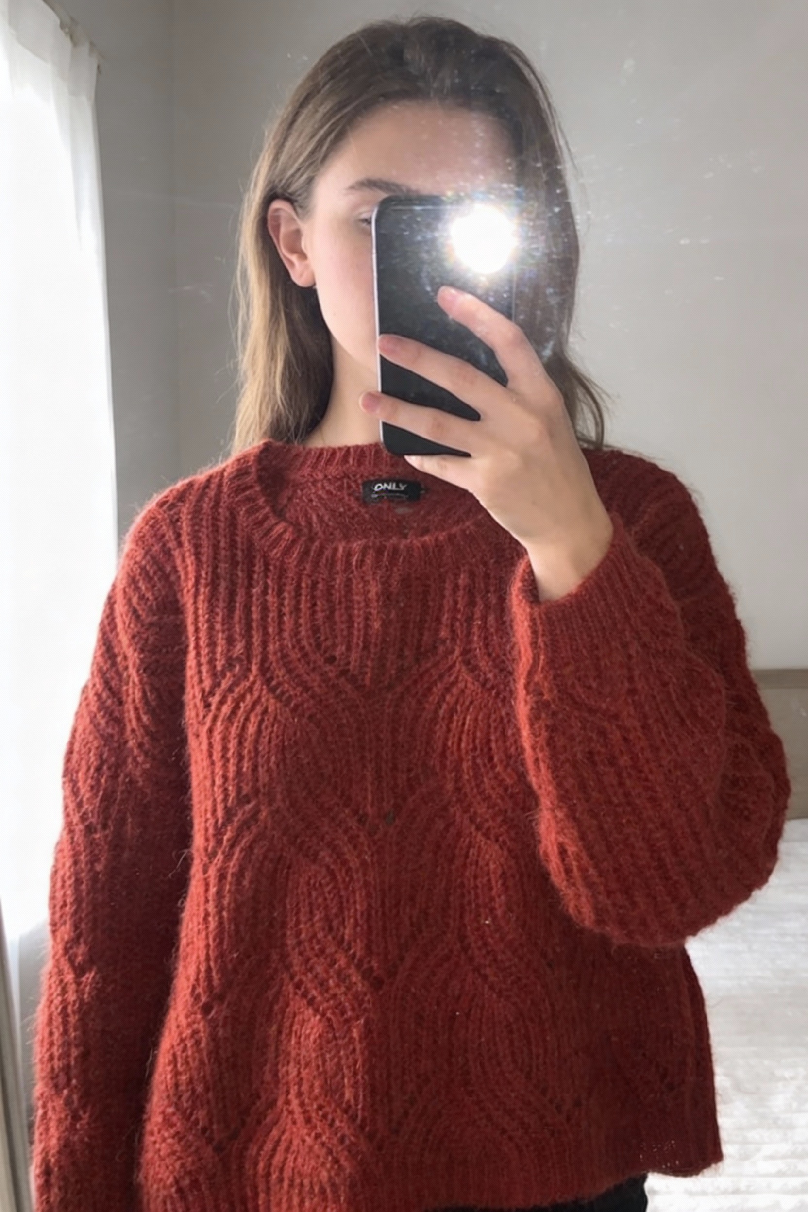 Pull Only - XL debout, face à la caméra, dans une chambre à la lumière douce, avec une lumière naturelle filtrant par la fenêtre.