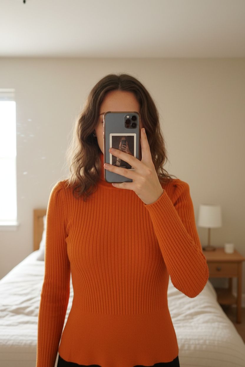 Pull orange col roulé Zara M très bon état” debout, face à la caméra, dans une chambre à la lumière douce, avec une lumière naturelle filtrant par la fenêtre.