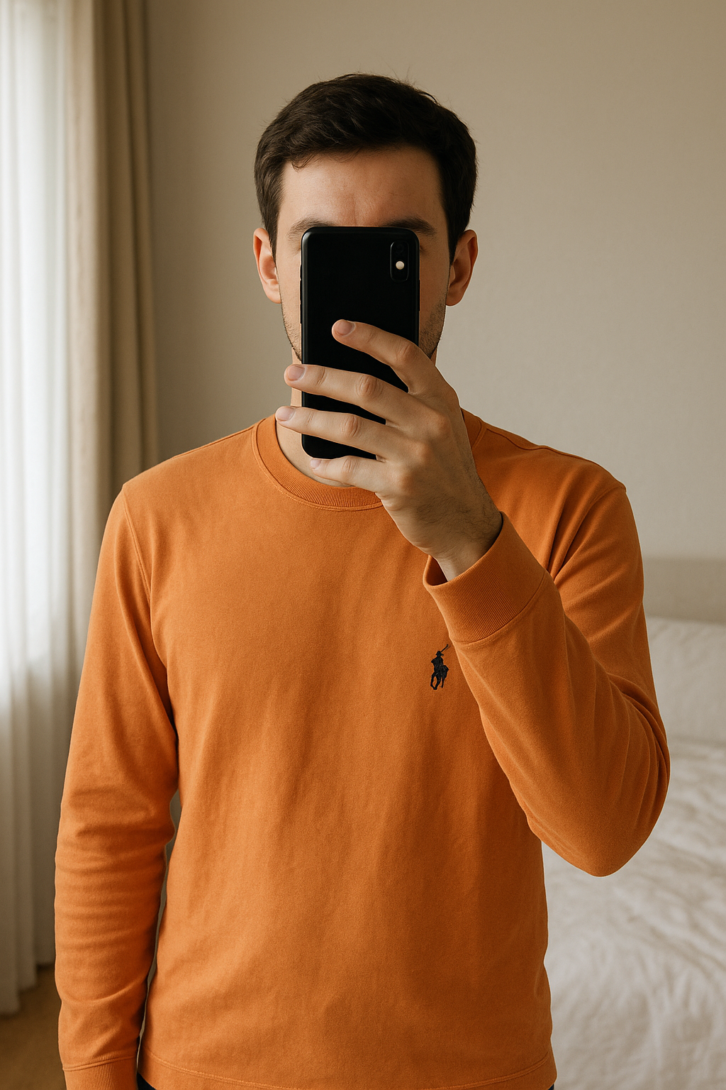 Pull orange Ralph Lauren taille s debout, face à la caméra, dans une chambre à la lumière douce, avec une lumière naturelle filtrant par la fenêtre.