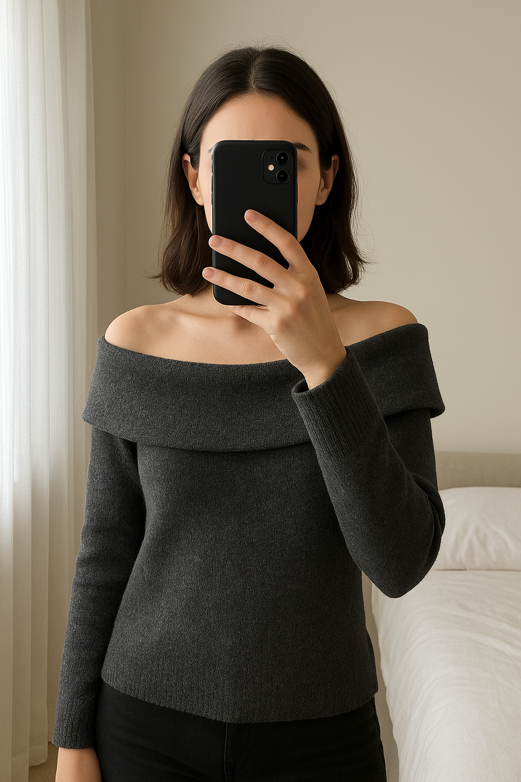 pull épaules dénudés debout, face à la caméra, dans une chambre à la lumière douce, avec une lumière naturelle filtrant par la fenêtre.