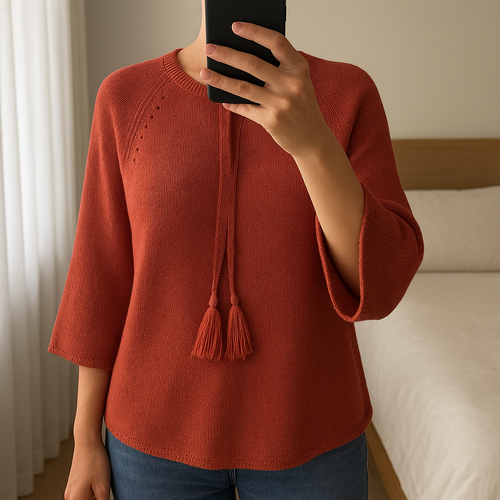 Pull poncho promod Taille M debout, face à la caméra, dans une chambre à la lumière douce, avec une lumière naturelle filtrant par la fenêtre.