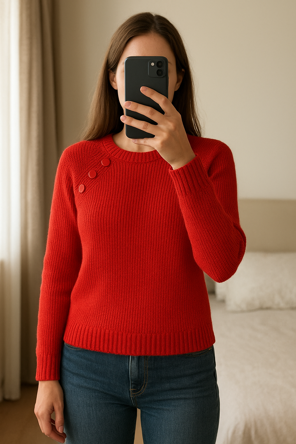 Pull rouge • taille S • cache cache debout, face à la caméra, dans une chambre à la lumière douce, avec une lumière naturelle filtrant par la fenêtre.