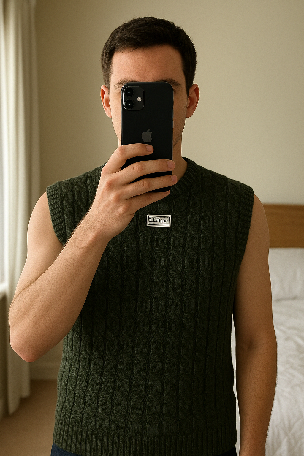 Pull sans manche Vert L.L.Bean Homme - Taille L debout, face à la caméra, dans une chambre à la lumière douce, avec une lumière naturelle filtrant par la fenêtre.