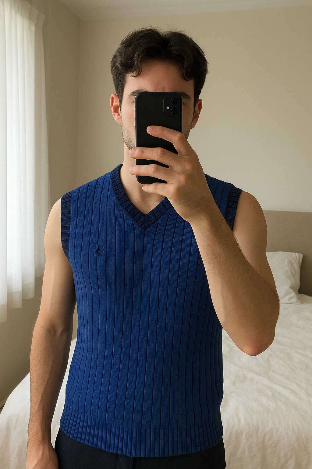 Pull sans manches Polo Ralph Lauren Homme taille L debout, face à la caméra, dans une chambre à la lumière douce, avec une lumière naturelle filtrant par la fenêtre.