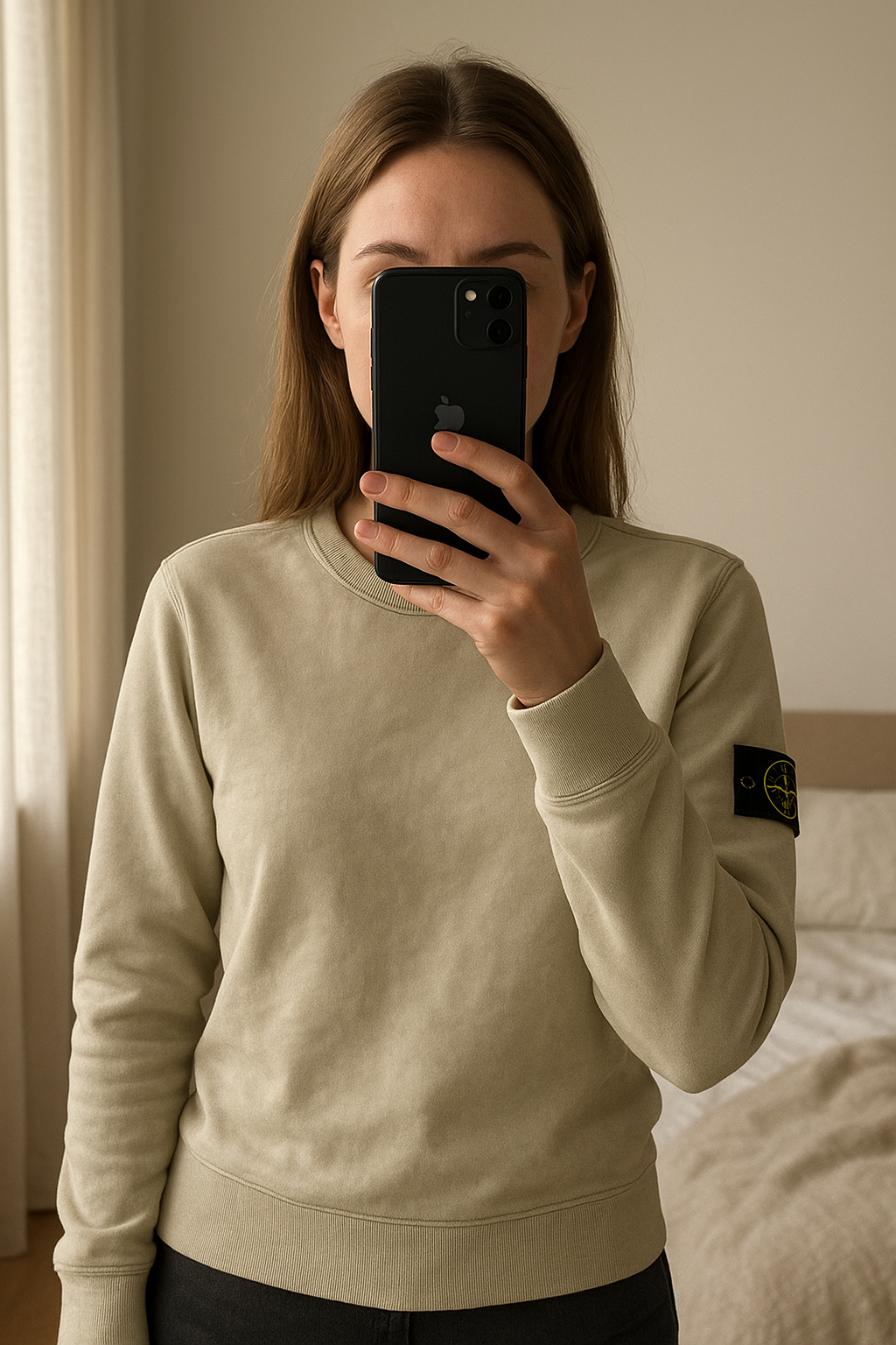 pull stone island debout, face à la caméra, dans une chambre à la lumière douce, avec une lumière naturelle filtrant par la fenêtre.