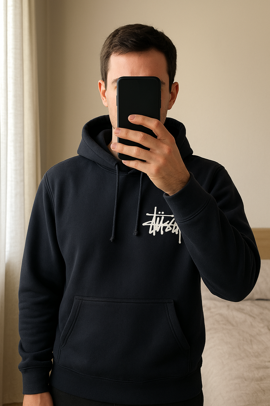 Pull stussy debout, face à la caméra, dans une chambre à la lumière douce, avec une lumière naturelle filtrant par la fenêtre.