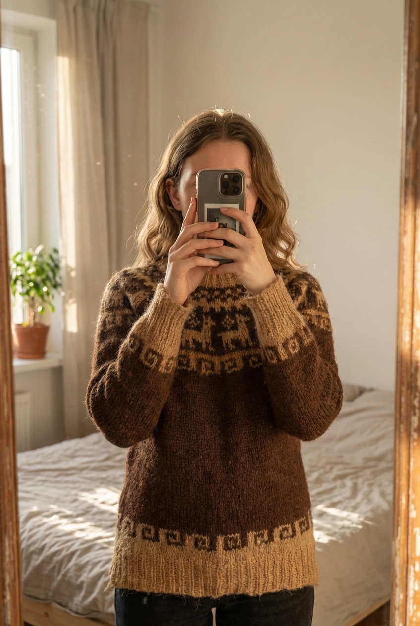 Pull style Nordique Iceland Sweater Vintage Fait Main Tricot 100% Alpaga Marron Beige XS debout, face à la caméra, dans une chambre à la lumière douce, avec une lumière naturelle filtrant par la fenêtre.