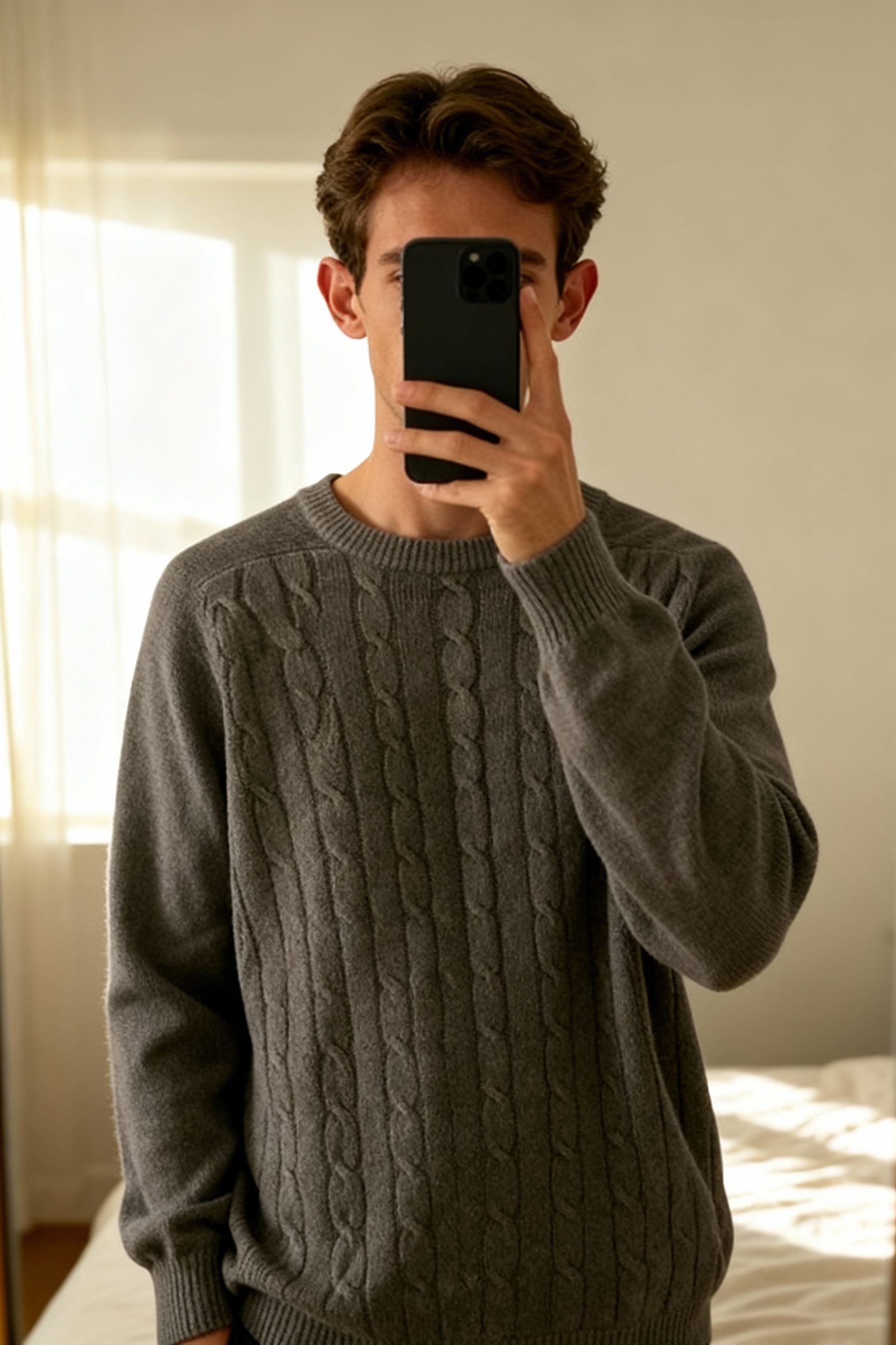 Pull vintage debout, face à la caméra, dans une chambre à la lumière douce, avec une lumière naturelle filtrant par la fenêtre.
