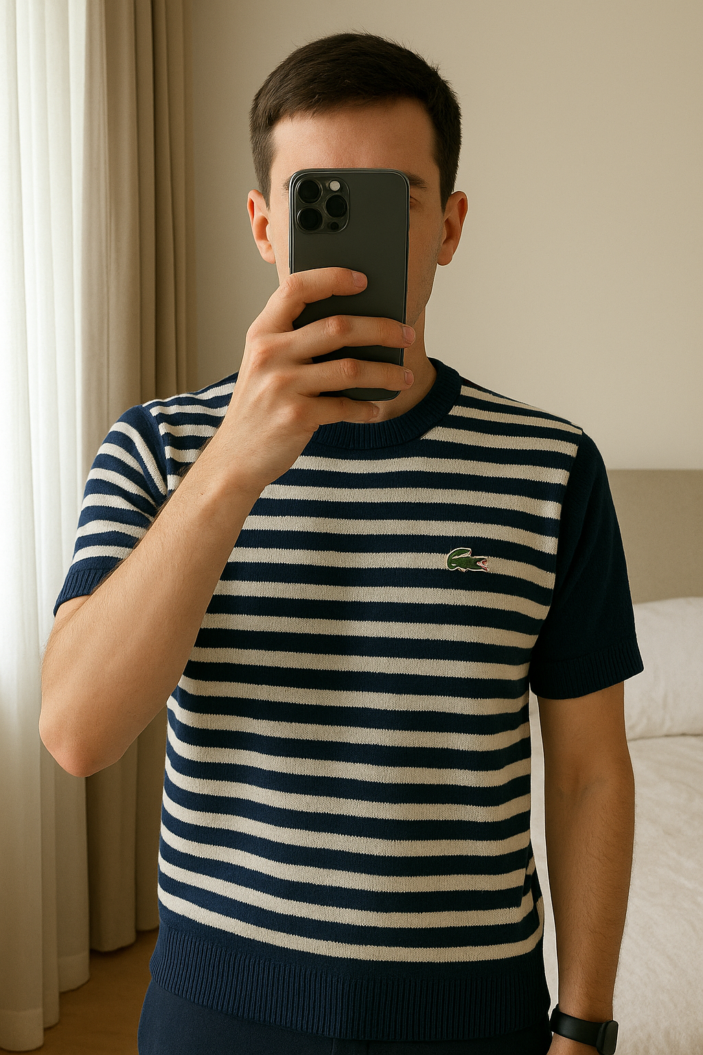 Pull vintage manche courte marinière - Lacoste -Taille 42 debout, face à la caméra, dans une chambre à la lumière douce, avec une lumière naturelle filtrant par la fenêtre.