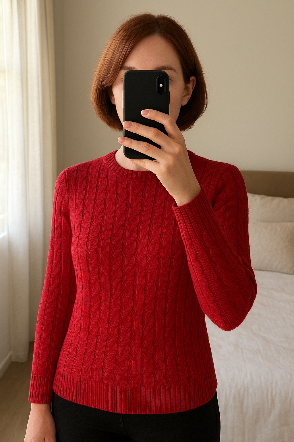 Pull vintage à torsades t M vintage debout, face à la caméra, dans une chambre à la lumière douce, avec une lumière naturelle filtrant par la fenêtre.