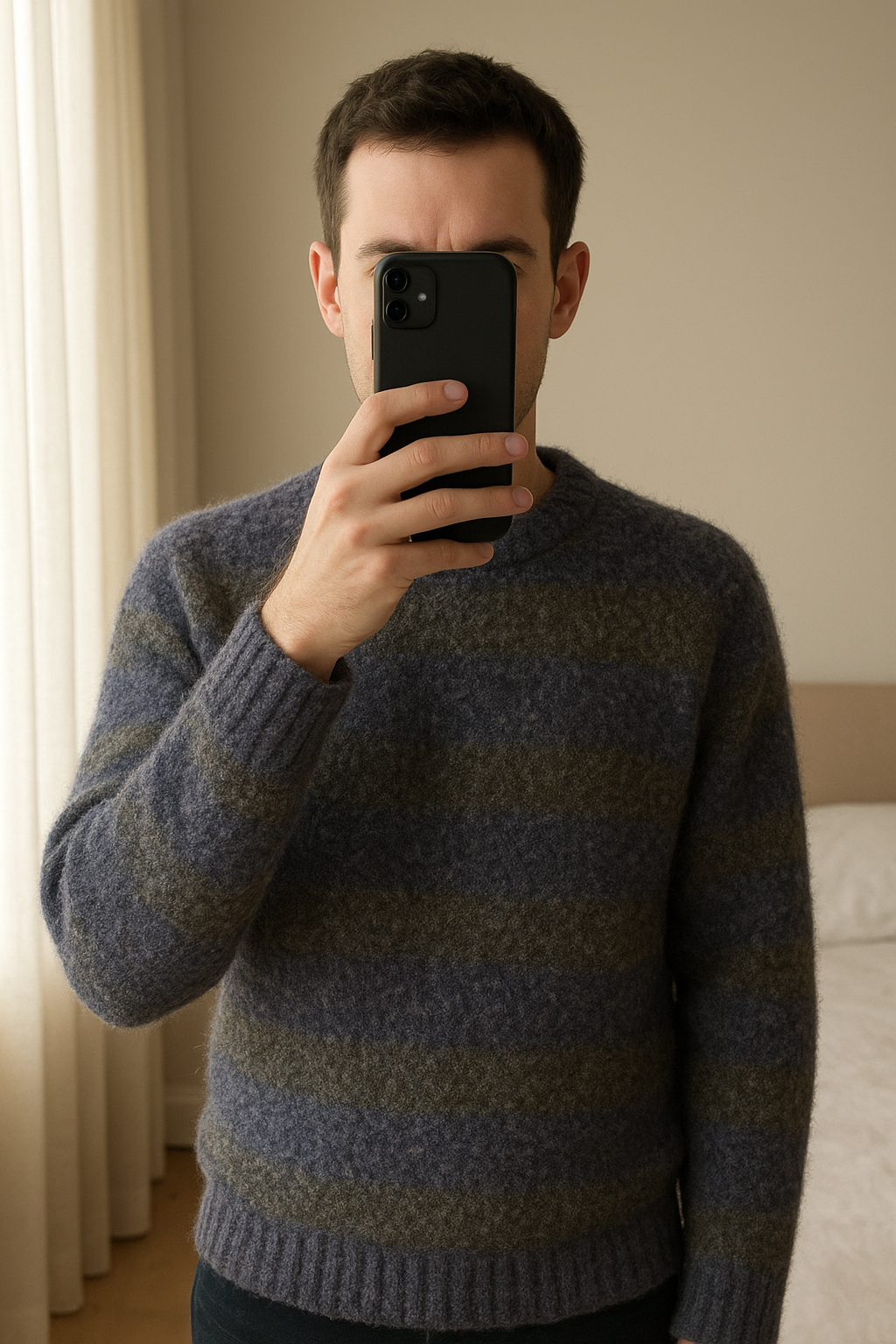 Pull Weekday debout, face à la caméra, dans une chambre à la lumière douce, avec une lumière naturelle filtrant par la fenêtre.