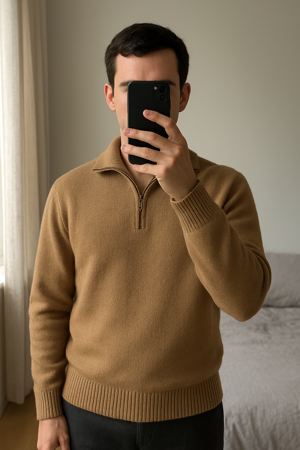 Pull Zara homme debout, face à la caméra, dans une chambre à la lumière douce, avec une lumière naturelle filtrant par la fenêtre.