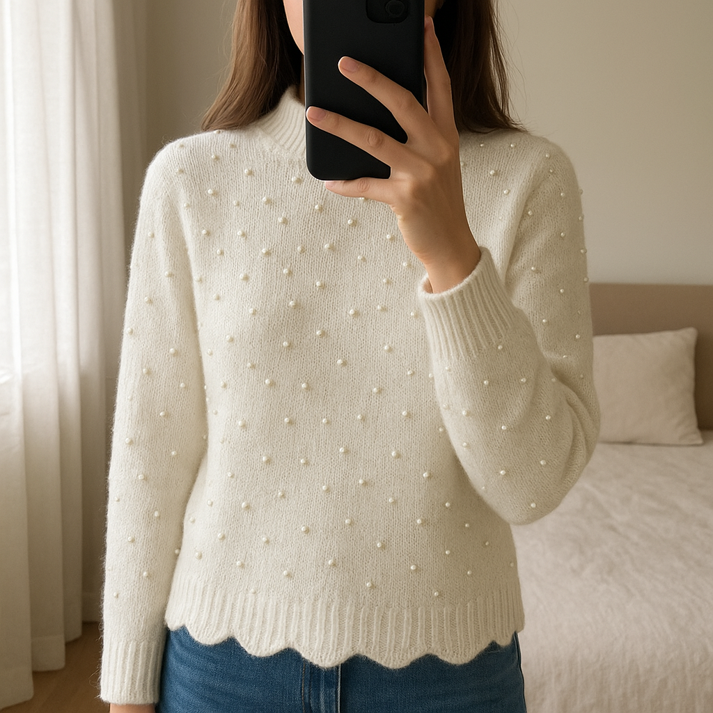 Pull Zara Perles T36 debout, face à la caméra, dans une chambre à la lumière douce, avec une lumière naturelle filtrant par la fenêtre.
