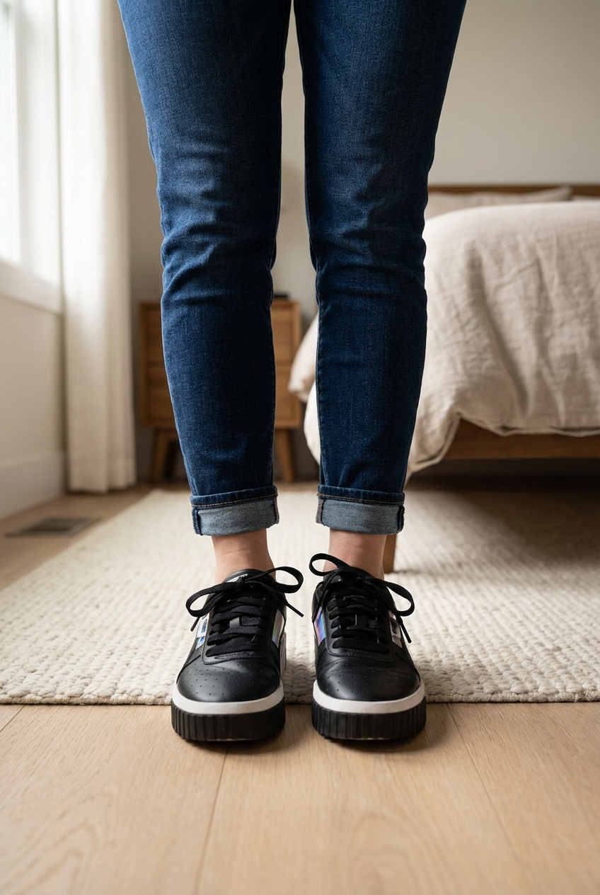 Puma Cali Glow tenisice standing straight facing the camera, in a softly lit bedroom setting, with gentle natural light filtering through a window.